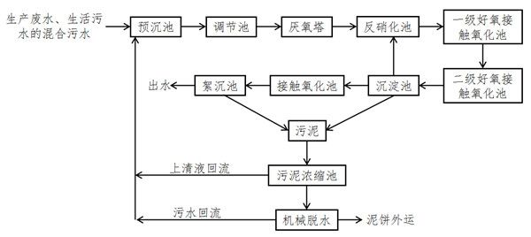 生物接觸氧化法是一種介于活性污泥法與生物濾池兩者之間的生物處理技術(shù),兼具兩者的優(yōu)點。其實質(zhì)就是在池內(nèi)充填填料,在填料上布滿生物膜,充氧污水與生物膜廣泛接觸,在生物膜上微生物的新陳代謝功能的作用下,污水中有機物及其它控制指標(biāo)得到去除,污水得到凈化,具有較高的處理效率。接觸氧化池出水進入絮沉池,進行泥水分離,出水達(dá)標(biāo)排放。